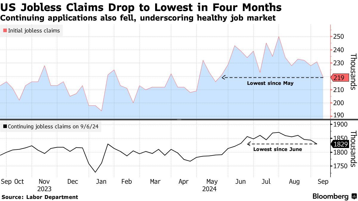 尽管就业市场显示出放缓迹象,但美国初请失业金人数在近几个月都保持在较低水平。美联储周三降息50个基点的决定反映了政策制定者打算维持美联储主席鲍威尔所说的“仍然稳固”的劳动力市场。