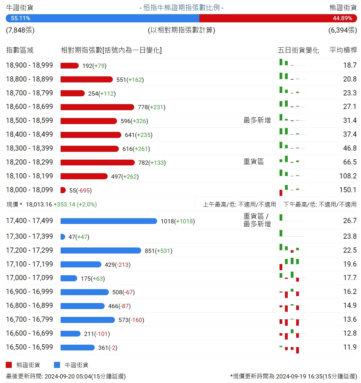智通财经APP获悉,截至9月20日,恒指最新的牛熊街货比例为55:45。