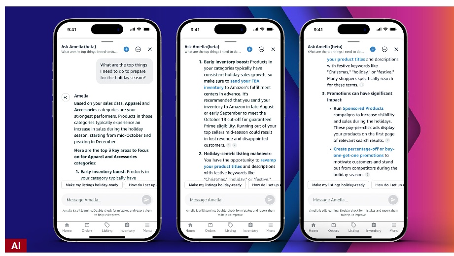 据了解,根据内部测试结果,亚马逊的卖家们可以使用Amelia提出诸如“我需要为假日购物季准备什么最重要的事情?”这样的问题。该AI助手将回复与商品库存相关的最佳实践以及与特定商家的库存和过去客户销售指标相关的最佳实践的个性化信息。这使得亚马逊电商平台的卖家们能够为兴趣激增的产品线做好准备,或者选择之前几个购物季度最畅销的产品类别,并确定哪种独特的促销方式最适合将它们放在大多数购物者面前。