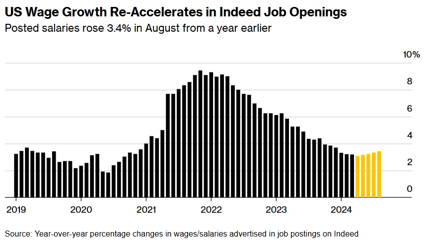根据Indeed Hiring Lab的数据,8月公布的薪资同比增长3.4%,标志着连续第四个月加速增长。