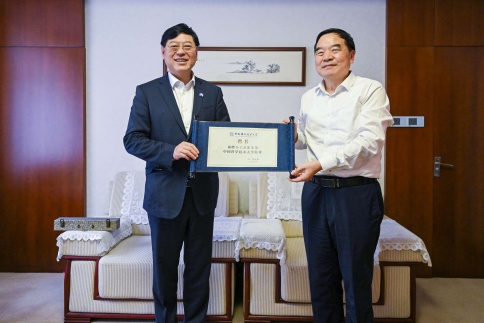 校长包信和(右)代表中国科学技术大学向杨元庆(左)颁发聘书