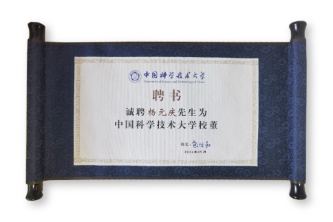 9月20日,在中国科学技术大学66周年校庆之际,联想集团董事长兼CEO、中国科大计算机科学系校友杨元庆重返母校,并被聘任为中国科学技术大学校董,校长包信和代表学校向其颁发聘书。