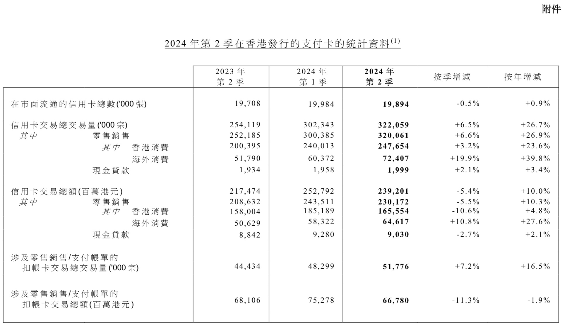 智通财经APP获悉,9月20日,香港金管局公布2024年第二季在香港发行的支付卡的统计资料。根据季度统计资料,于2024年第二季末,在市面流通的信用卡总数为1989万张,按季下跌0.5%,按年上升0.9%。信用卡交易量及金额(包括零售销售及现金贷款)容易受季节因素及整体经济环境影响,走势较为波动。在2024年第二季,信用卡总交易量为32 206万宗,较上一季增加6.5%,较2023年同期则增加26.7%。2024年第二季的信用卡交易总额为2,392亿港元,较上一季减少5.4%,与2023年同期比较增加10.0%。交易总额当中,1,656亿港元(69.2%)为香港消费,646亿港元(27.0%)为海外消费,90亿港元(3.8%)为现金贷款。