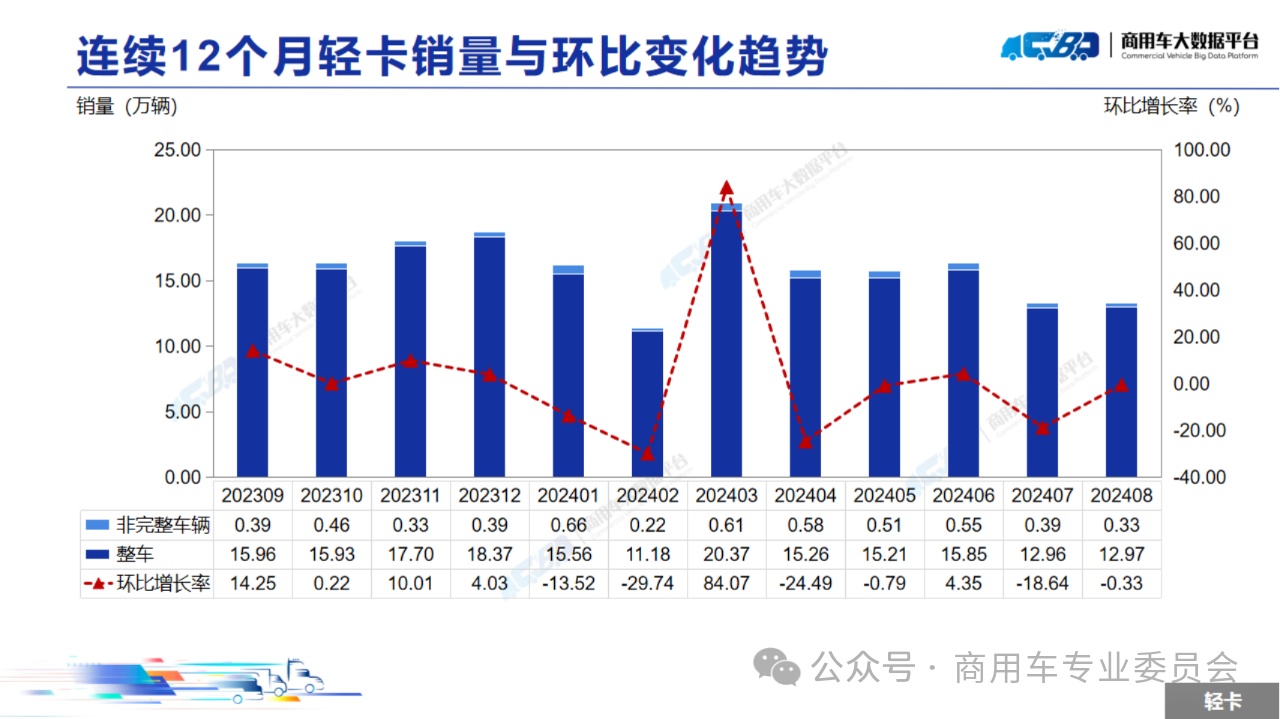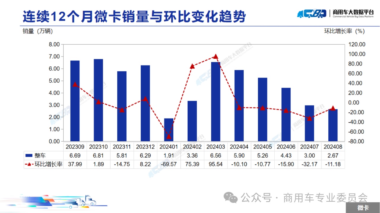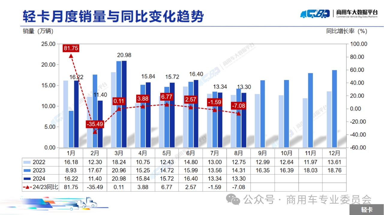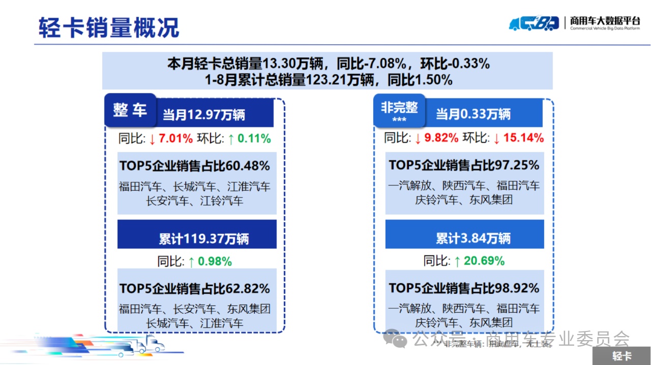 智通财经APP获悉,据中国汽车流通协会9月20日消息,2024年8月全国轻型卡车销量(批发)为13.30万辆,同比下降7.08%,环比下降0.33%;微型卡车销量(批发)为2.67万辆,同比下降44.97%,环比下降11.18%。2024年1-8月全国累计轻型卡车销量(批发)为123.21万辆,同比上涨1.50%;累计微型卡车销量(批发)为33.09万辆,同比下降8.54%。