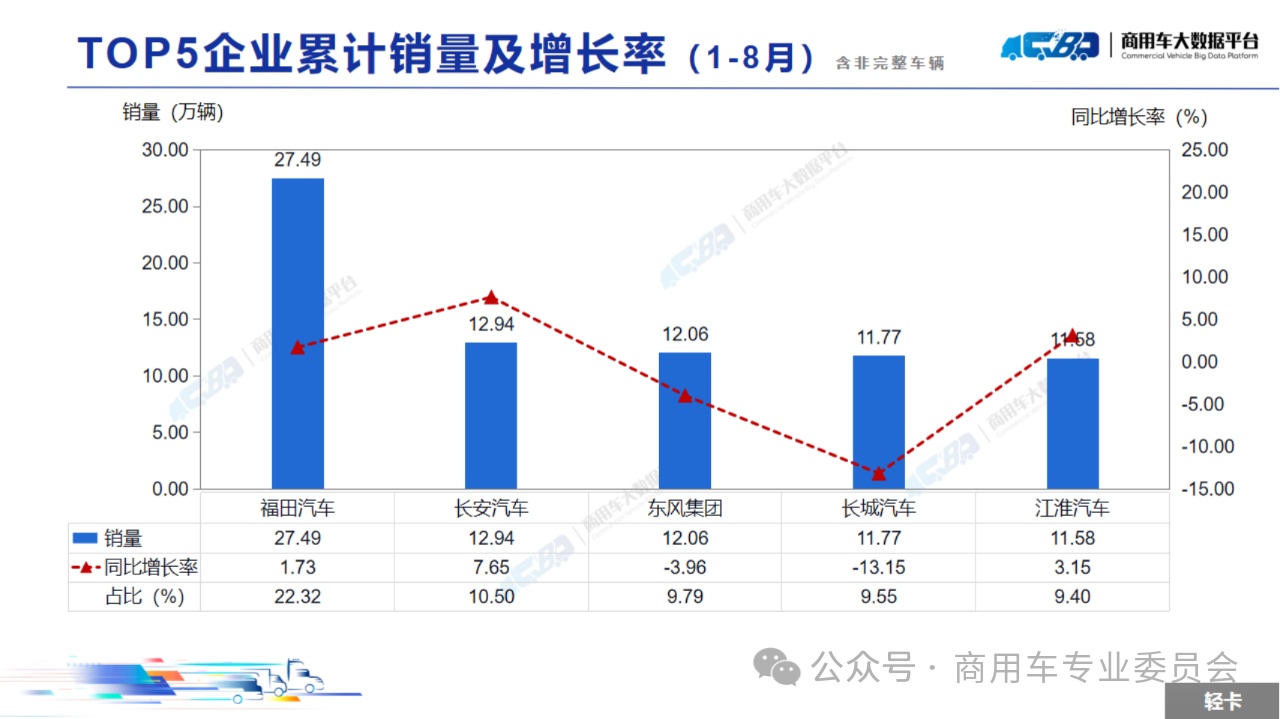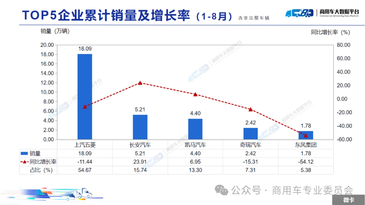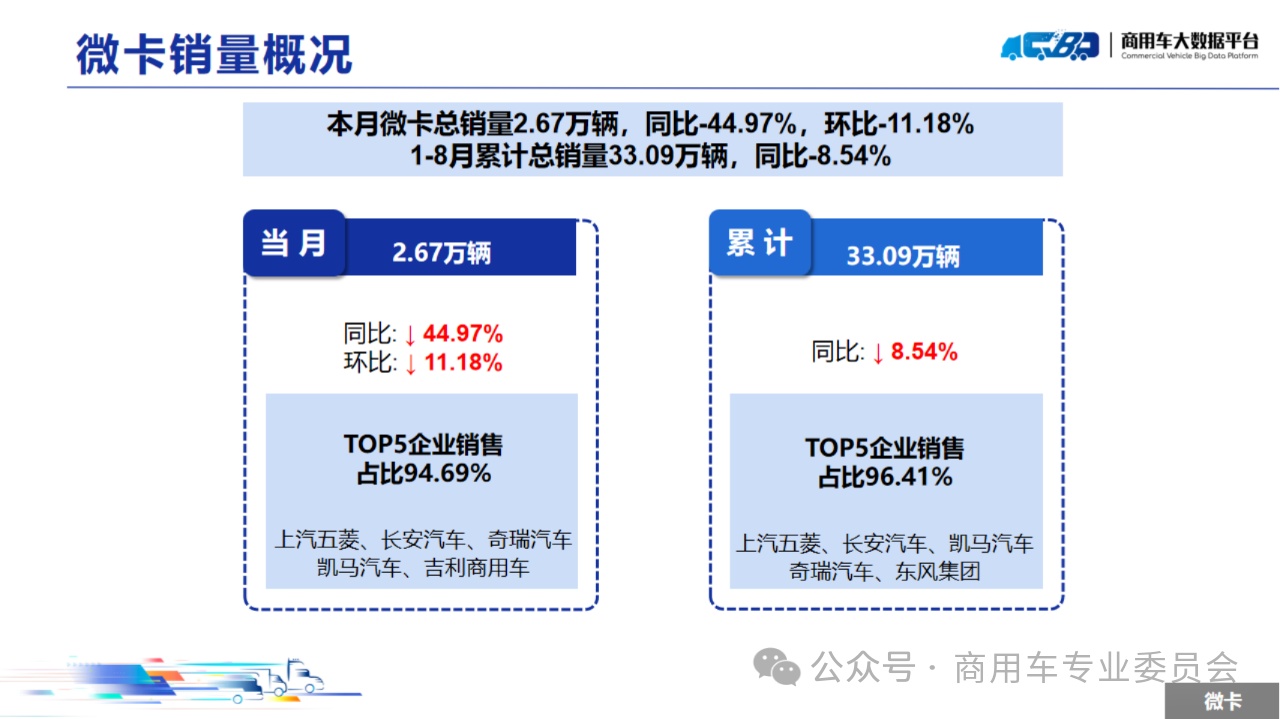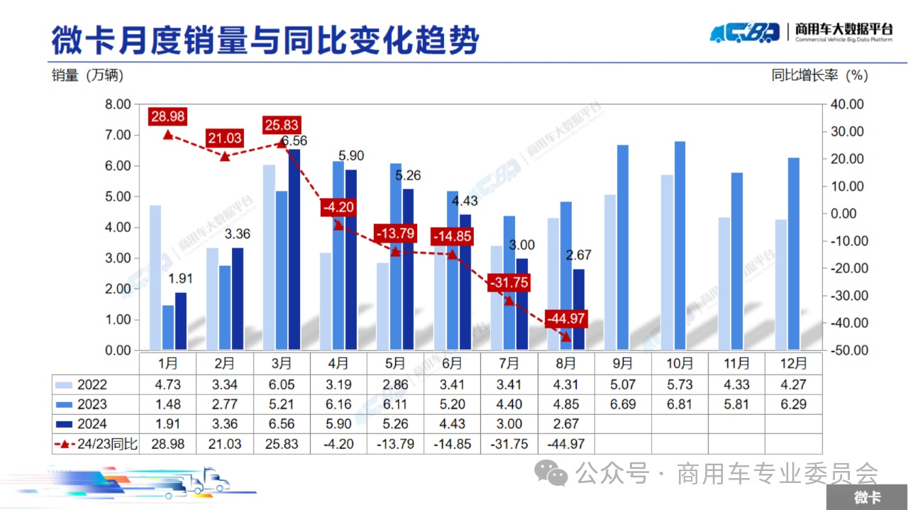 智通财经APP获悉,据中国汽车流通协会9月20日消息,2024年8月全国轻型卡车销量(批发)为13.30万辆,同比下降7.08%,环比下降0.33%;微型卡车销量(批发)为2.67万辆,同比下降44.97%,环比下降11.18%。2024年1-8月全国累计轻型卡车销量(批发)为123.21万辆,同比上涨1.50%;累计微型卡车销量(批发)为33.09万辆,同比下降8.54%。