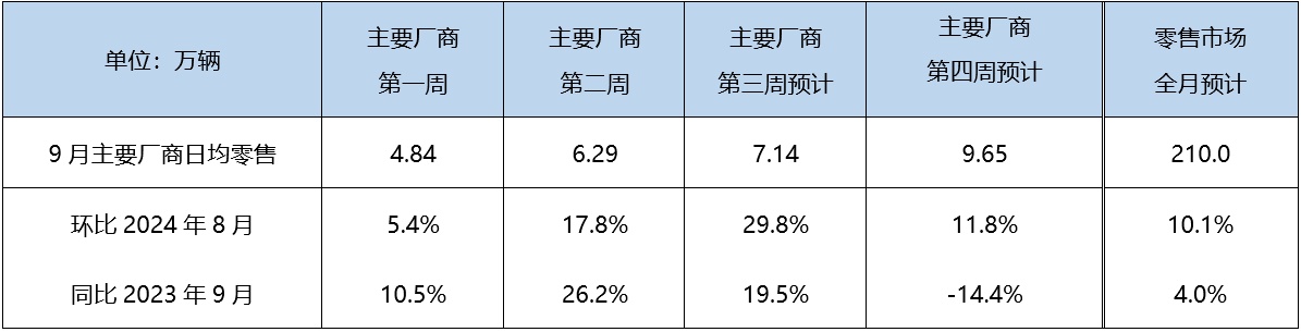 9月第1周日均零售4.84万辆,同比10.5%,环比5.4%,8月底的较高市场热度得以延续。第2周为中秋节节前且有6个完整的工作日,日均零售达6.29万辆,同比26.2%,环比17.8%。第3周包含了中秋假期及节后,终端在节日期间吸引了大波订单并陆续交付,日均零售7.14万辆,同比19.5%,环比29.8%。2023年中秋假期较晚,与国庆假期连放,2023年的9月第4周为节前集中交车,因此同比基数较高;今年9月第4周节奏预计相对较为平稳,日均零售9.65万辆,同比-14.4%,环比11.8%,综合估算9月零售可达到210万辆左右。