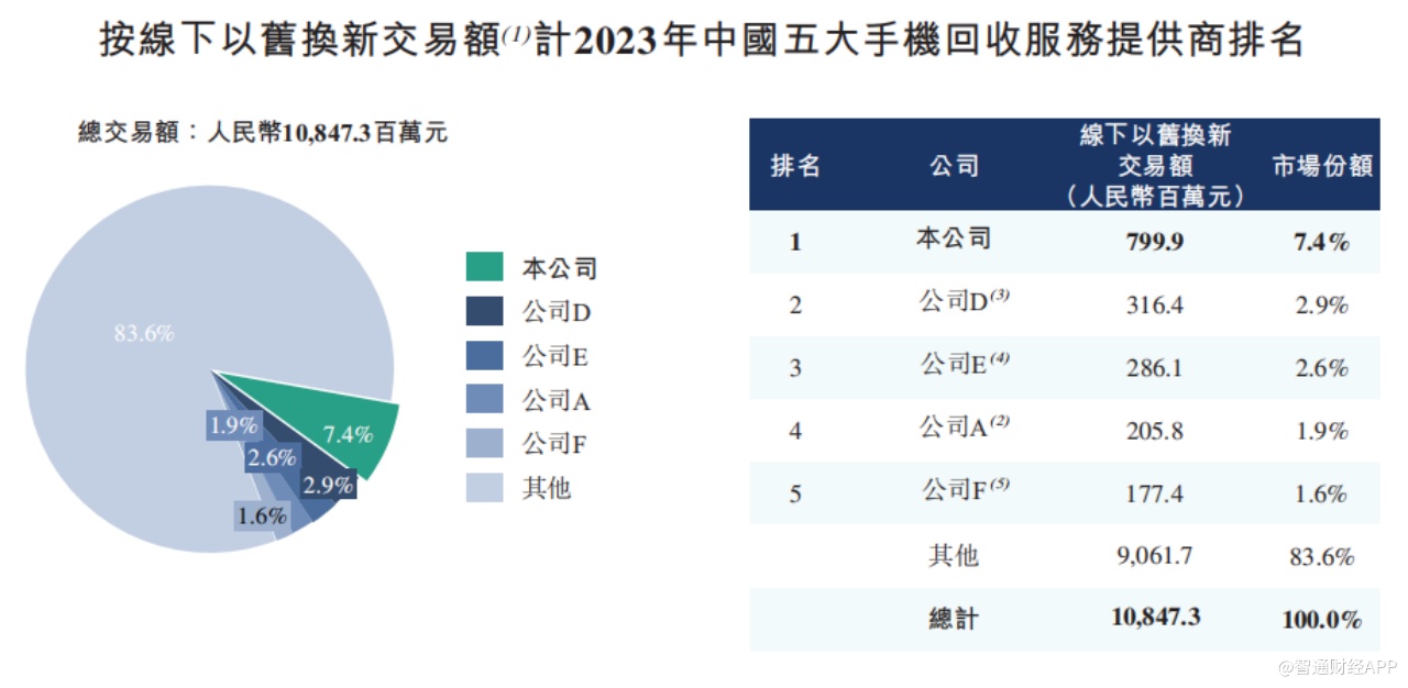 招股书显示,闪回科技是一家从事提供消费电子产品后市场交易服务的中国公司,专注于手机回收服务市场。根据弗若斯特沙利文的资料,以2023年自消费者端回收交易总额计,公司是中国最大的提供线下以旧换新的手机回收服务提供商,亦是中国第三大手机回收服务商,市场份额分别约为7.4%及1.4%。根据弗若斯特沙利文的资料,于2023年,按自消费者回收的手机销售金额计,公司也是中国第三大手机回收服务商。
