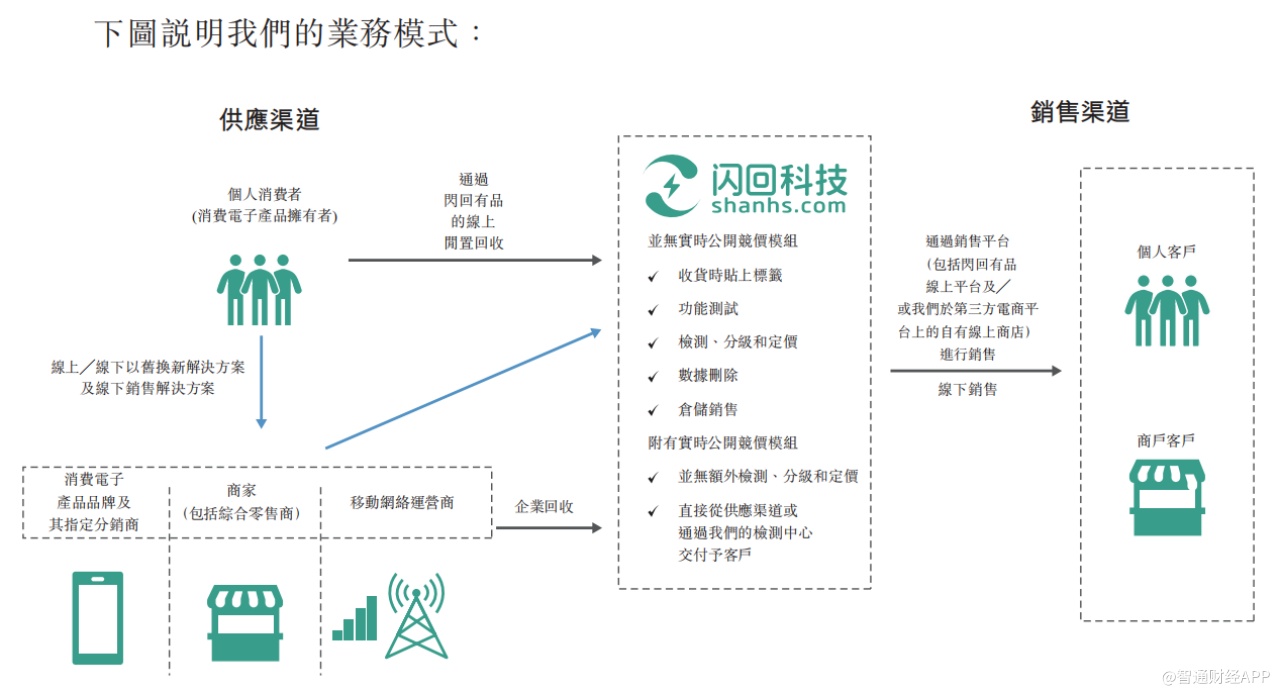 闪回科技主要通过在使用回收系统闪回收的上游采购合作伙伴的线下及/或在线商店进行的以旧换新交易获得二手消费电子产品的供应。个人消费者(即最终供应商)通过将其二手消费电子产品进行以旧换新作为付款的一部分,以折价购买新消费电子产品。然后,在公司的检测及运营中心凭借专有的检测、分级和定价技术对采购的该等二手消费电子产品进行处理,并主要通过公司的在线平台闪回有品以及在多个第三方电子商务平台上运营的自有网店,高效地将有关电子产品销售给二手消费电子产品市场的各类买家。