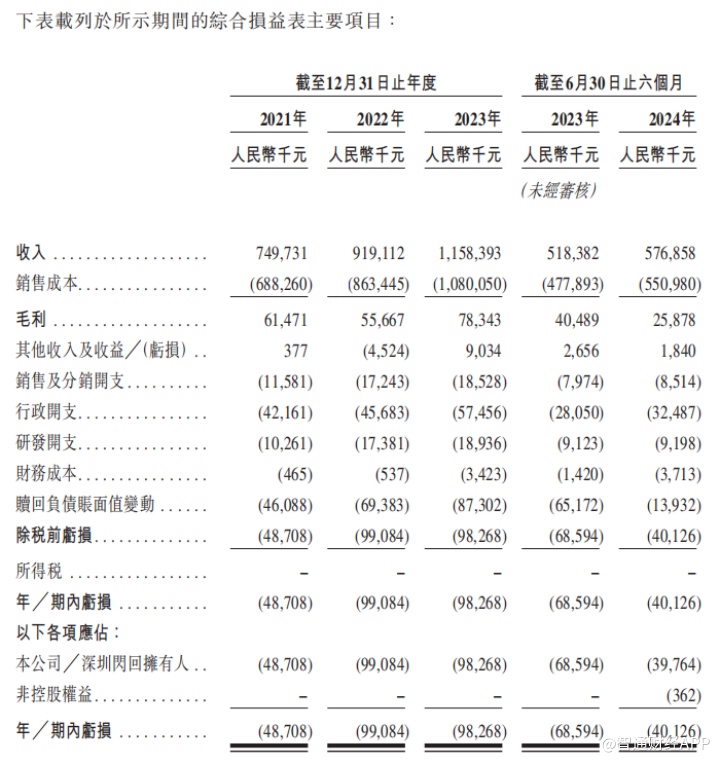 业绩方面,于2021年、2022年、2023年及2024年截至6月30日止六个月,闪回科技实现收入分别约为7.5亿元、9.19亿元、11.58亿元、5.77亿元,同期年内亏损分别为4870.8万元、9908.4万元、9826.8万元、4012.6万元。