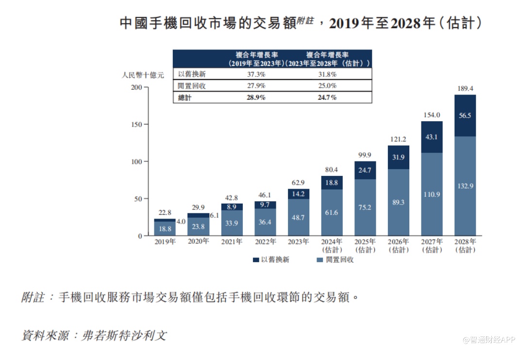 根据弗若斯特沙利文报告,中国手机回收市场还有较为广阔的发展空间。就以旧换新的回收手机交易额而言,于中国的市场由2019年的40亿元迅速增至2023年的142亿元,复合年增长率约37.3%,且预计进一步增至2028年约565亿元。就闲置回收的回收手机交易额而言,统计数字由2019年约188亿元增至2023年约487亿元,且预计进一步增至2028年约1329亿元。