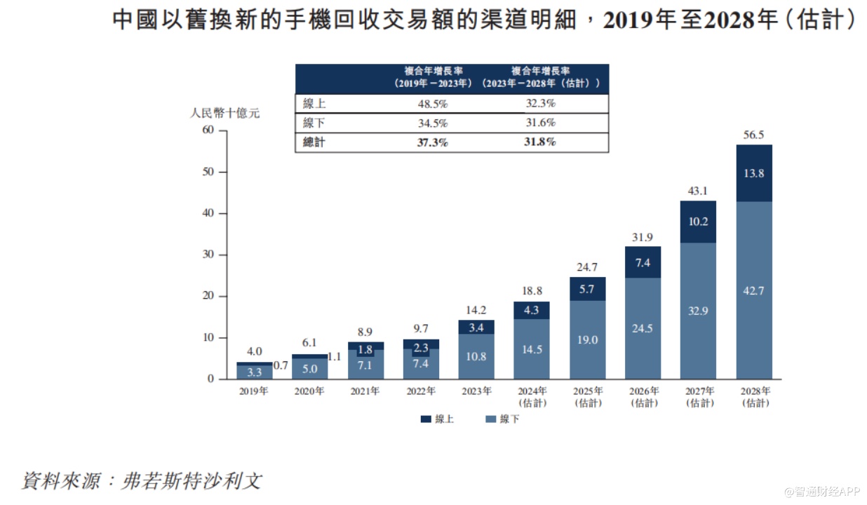 值得注意的是,新手机的消费升级将带动消费者处理旧手机或闲置手机的需求上升,从而令中国二手消费电子产品交易市场以及手机回收市场增长。就以旧换新的回收手机交易额而言,中国的市场规模由2019年的40亿元(人民币,下同)增至2023年的142亿元,复合年增长率约37.3%,且预计进一步增至2028年约565亿元。