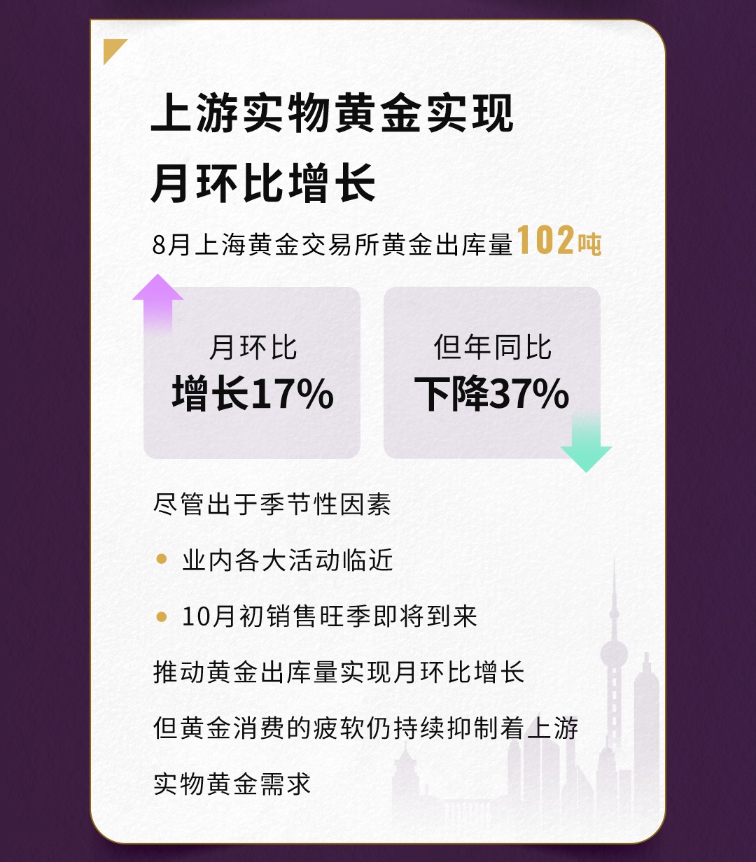 智通财经APP获悉,世界黄金协会发文称,8月上海黄金交易所黄金出库量102吨,月环比增长17%,但年同比下降37%。尽管出于季节性因素(业内各大活动临近、10月初销售旺季即将到来)推动黄金出库量实现月环比增长,但黄金消费的疲软仍持续抑制着上游实物黄金需求。