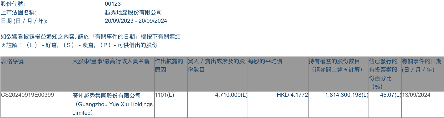 智通财经APP获悉,香港联交所最新资料显示,9月13日,广州越秀集团增持越秀地产(00123)471万股,每股作价4.1772港元,总金额约1967.46万港元。增持后最新持股数目约18.14亿股,最新持股比例45.07%。