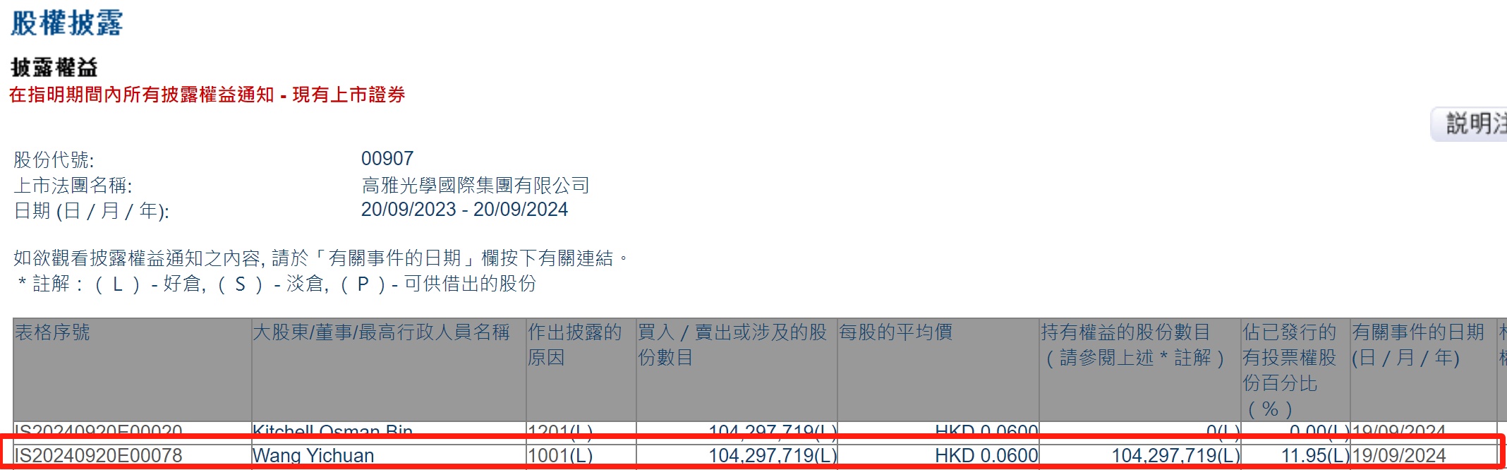 Yichuan增持高雅光学(00907)1.04297719亿股,平均每股作价为0.06港元,总金额约为625.79万港元。增持后最新持股数目约为1.04亿股,最新持股比例为11.95%。