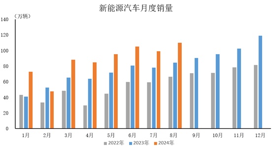 2024年8月,新能源汽车国内销量99万辆,环比增长11.6%,同比增长30.9%。