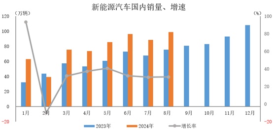 2024年1-8月,新能源汽车国内销量621.9万辆,同比增长33.8%。