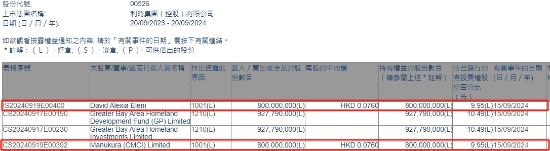 Eleni增持利时集团控股(00526)8亿股,每股作价0.076港元,涉及总金额为6080万港元。增持后最新持股数目为8亿股,最新持股比例为9.95%。