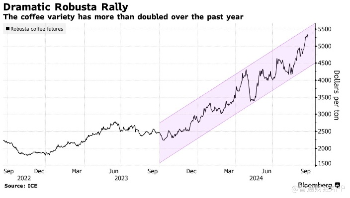 罗布斯塔咖啡价格在过去一年大幅上涨