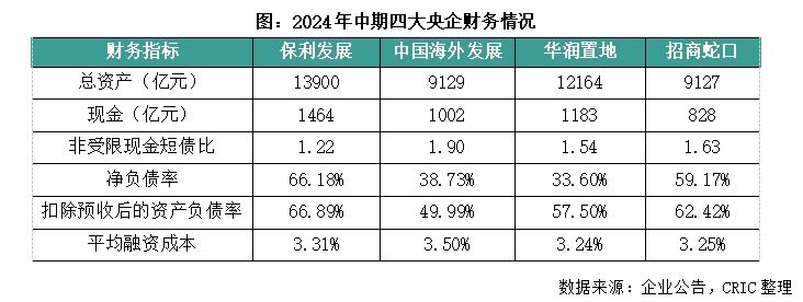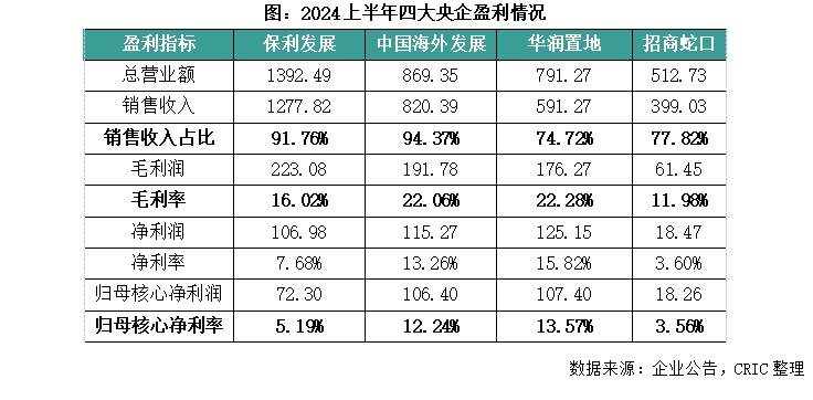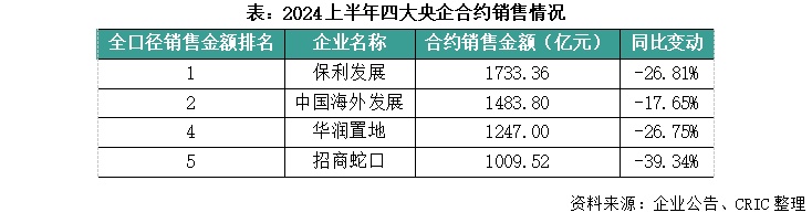 智通财经APP获悉,克而瑞地产研究发布研报称,保利发展(600048.SH)、中海地产(00688)、华润置地(01109)、招商蛇口(001979.SZ)四大央企近年来发展势头迅猛,2024上半年几家企业的合约销售额都超过了1000亿元,保利发展继续保持着销售第一的地位,与后面几家房企拉开了较大的差距。中海继续以利润王著称,华润大力发展第二曲线,招商持续发挥产业推动优势。