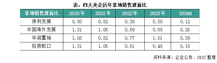 在拿地规模方面,随着房地产市场的下行,即使有着一定社会责任的四大央企也出于企业整体运营的考虑减少了拿地规模,2024上半年拿地销售建面比最低的是保利发展,仅有0.12。相较之下,华润的拿地销售建面比达到了0.39,在四家企业中是最高的。从历年的表现来看,华润置地的拿地销售建面比在几家央企中整体都相对较高。