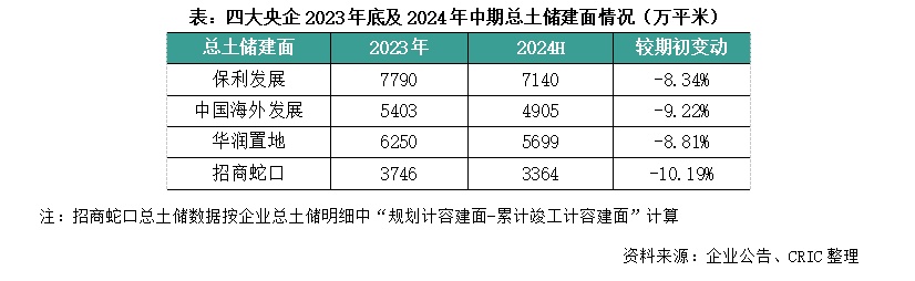 拿地的减少,直接导致的是企业总土储规模的收缩。从2024年中期的情况来看,四大央企的总土储建面相较于期初都减少了8%以上,减少最多的招商蛇口超过了10%。从土储绝对数量来看,保利发展以7140万平米的规模稳居第一,其次则是华润置地的5699万平米。