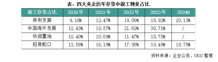 在销售下行的背景下,房企都面临着去库存的压力,四大央企也不例外。从四家企业披露的存货情况来看,已竣工物业(A股:开发产品,H股:持做销售物业)在存货中的占比近年来呈现逐渐提升的趋势,其中保利和中海的竣工存货占比都超过了20%,中海甚至达到了30.17%(2023年底数据),存货去化压力相对较大。