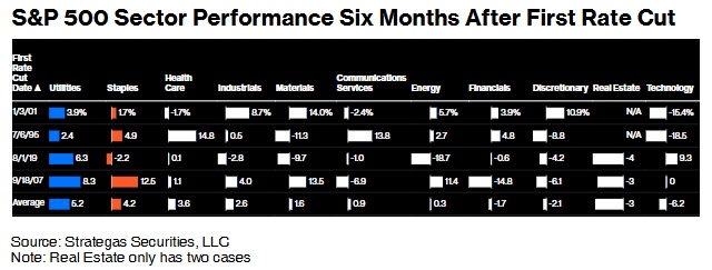 Strategas Securities的数据还显示,从上述四个降息周期的首次降息的六个月后来看,表现最好的板块是公用事业,平均上涨5.2%;科技板块表现最差,平均下跌6.2%;房地产、非必需消费品和金融板块也是跌幅居前的板块。