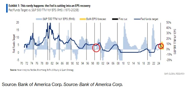 更重要的是,在过去的九个宽松周期中,有八个发生的企业盈利增长减速的时候。但美国银行美股与量化策略主管Savita Subramanian指出,目前企业盈利正在扩张,这有利于周期性股票和大盘股。他表示:“美联储没有剧本。每个宽松周期都是不同的。”