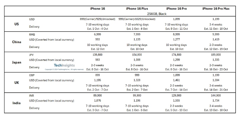 下表总结了iPhone 16系列(仅黑色256GB版本)在9月20日在美国、中国、日本、英国和印度五个主要市场的零售价格(美元及当地货币)和发货时间。