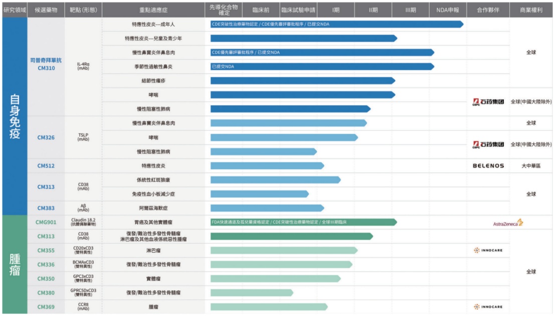 从康诺亚中报披露的管线情况看,公司当前仅有司普奇拜单抗这一款产品的一个适应症实现了商业化。此外,司普奇拜单抗的慢性鼻窦炎伴鼻息肉适应症和季节性过敏性鼻炎适应症还在NDA阶段。而除了司普奇拜单抗,公司其余管线产品进度均仅在II/III期。也就是说,短期内司普奇拜单抗需要仅凭单适应症撑起康诺亚整个公司的估值。