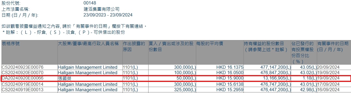 智通财经APP获悉,香港联交所最新资料显示,9月19日,主席张国荣增持建滔集团(00148)5万股,平均每股作价15.9港元,总金额为79.5万港元。增持后最新持股数目约为1316.69万股,最新持股比例为1.18%。
