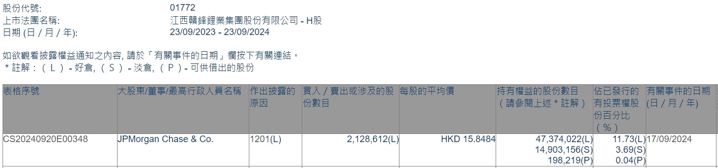 智通财经APP获悉,香港联交所最新资料显示,9月17日,小摩减持赣锋锂业(01772)212.8612万股,每股作价15.8484港元,总金额约为3373.51万港元。减持后最新持股数目约为4737.4万股,持股比例为11.73%。