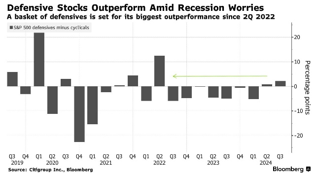 过去几个月,由于担心美国经济衰退,投资者纷纷涌向那些被认为相对不受经济衰退影响的股票,例如医疗保健和公用事业。自 6 月底以来,花旗集团的一篮子防御性股票上涨了约 11%,表现优于同类周期性股票指数8.5% 的涨幅。