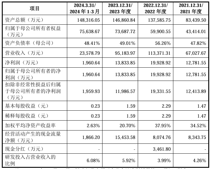 财务方面,于2021年度、2022年度、2023年度以及2024年1-3月,英思特实现营业收入分别约为人民币6.70亿元、11.34亿元、9.52亿元以及2.36亿元;同期,净利润分别为1.28亿元、1.99亿元、1.38亿元以及1960.64万元。