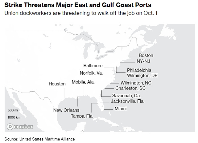 美国东部和墨西哥湾沿岸各大港口约有 45,000 名码头工人威胁于 10 月 1 日罢工。自 6 月份以来,谈判一直陷入僵局,业内官员现在认为罢工不可避免,远洋运输公司和港口运营商已开始向客户发出警告并制定应急计划。