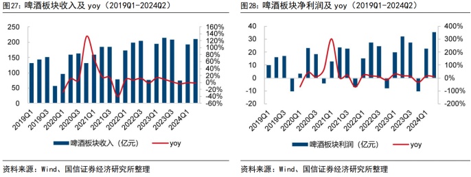 据了解,2024年大麦采购均价回落显著,玻璃、纸箱等包材价格仍有下降,且年初啤酒企业对铝材价格波动采取相应的锁价措施、减少铝材市价波动对成本端的影响,均使得啤酒板块整体成本有所下行。