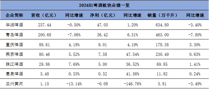 整体来看,上半年啤酒板块面临较大销售压力,即使在体育年、销售旺季的加持下依旧表现不及预期,但在原材料成本下降、费用控制水平良好等亮点的加持下,多数企业仍实现了净利润的正增长。