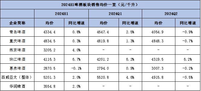 而分季度来看,受现饮消费场景缺失、消费力偏弱等因素影响,二季度行业高端化速度放缓,啤酒企业的销售均价同比增速普遍弱于一季度。头部企业中,百威亚太(中国区)、青岛啤酒、重庆啤酒二季度销售均价都同比有所下滑。