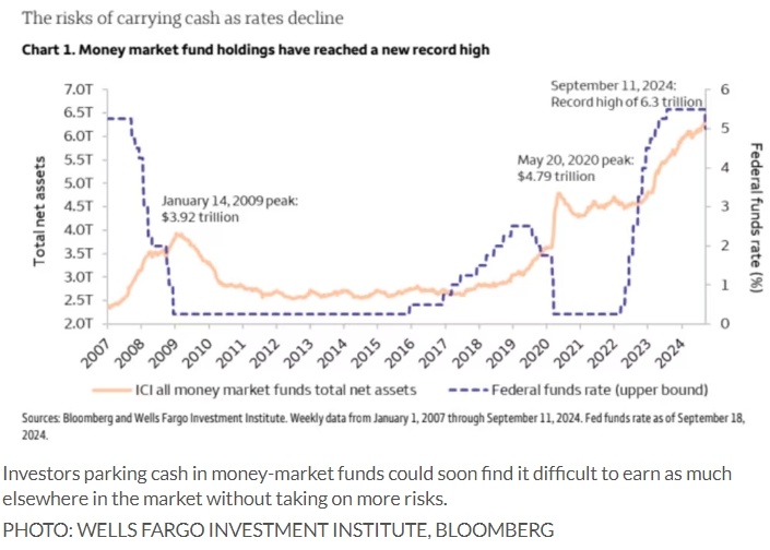 即使美联储开始降息,投资者在“现金”投资中赚取5%的收益且无需承担太多风险的策略,依然颇受欢迎。智通财经APP获悉,上周,货币市场基金——自2022年以来备受欢迎的现金投资工具——的资产总额超过了6.3万亿美元,即使美联储宣布大幅降息50个基点。
