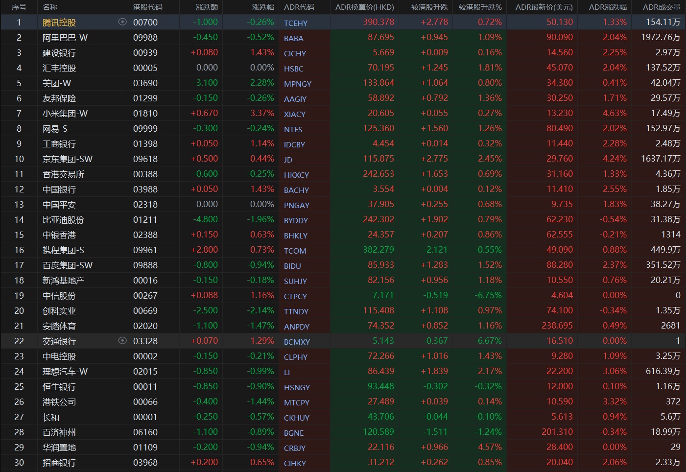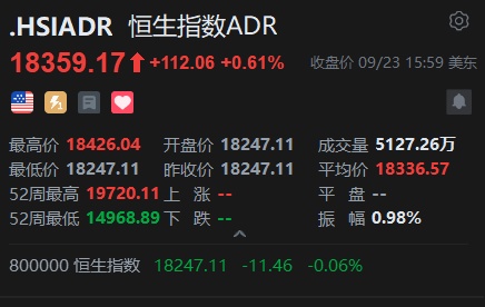 智通财经APP获悉,周一美股三大指数集体上涨,恒生指数ADR上涨,按比例计算,收报18359.17点,较香港收市上涨112.06点或0.61%。