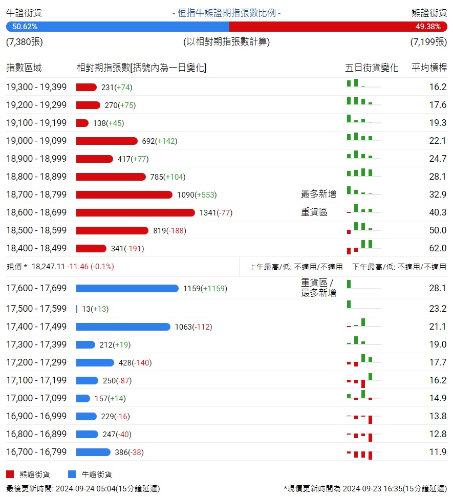 智通财经APP获悉,截至9月24日,恒指最新的牛熊街货比例为51:49。