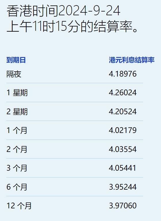 一周拆息升42基点至4.26024%,反映银行资金成本的三个月拆息连升两天,至4.05441%,为9月12日后最高。长息方面,六个月拆息进一步升至3.95244%,一年期亦升至3.9706%。