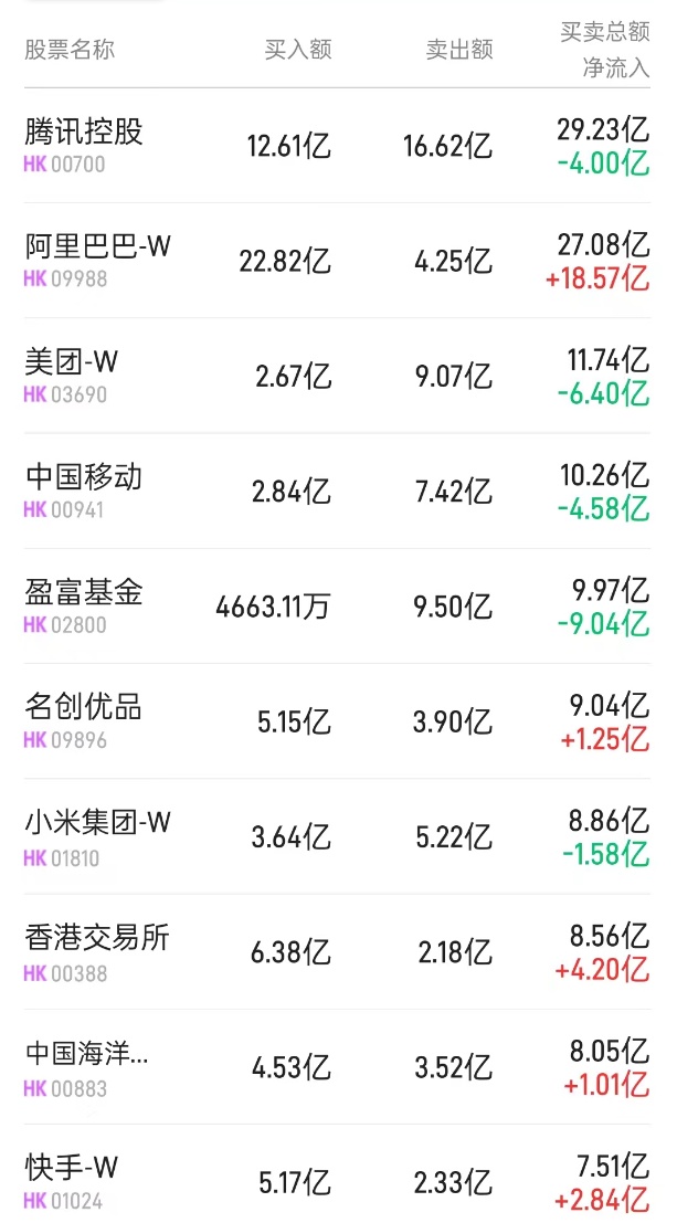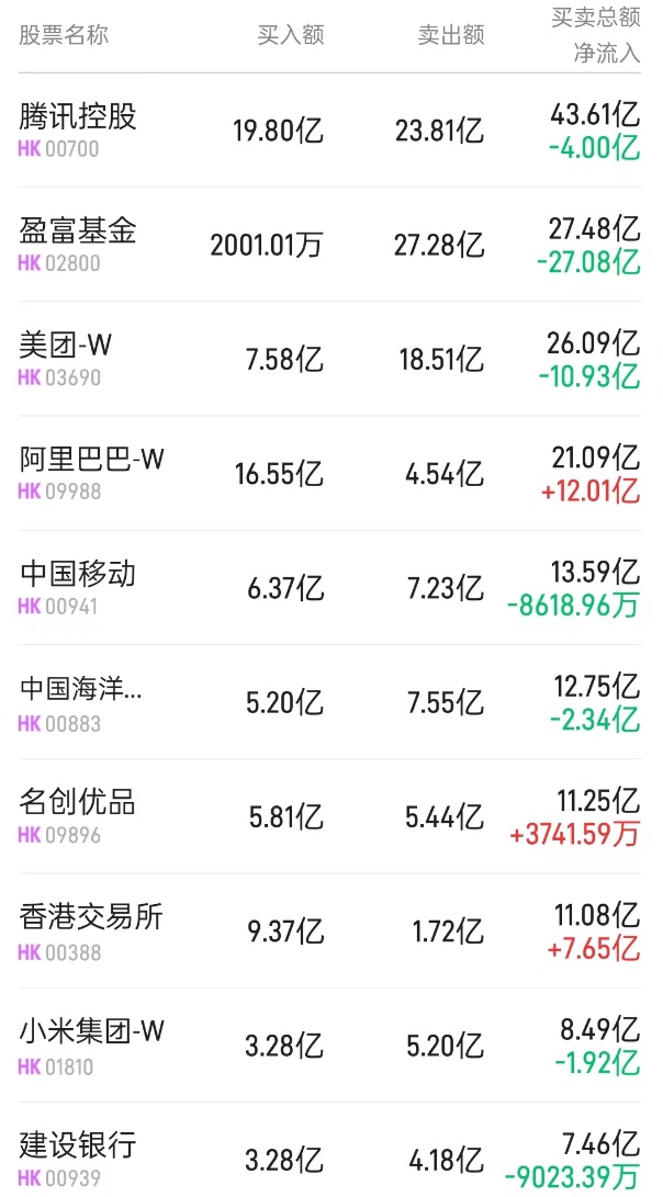 此外,腾讯(00700)、中国移动(00941)、中海油(00883)分别遭净卖出8亿、5.44亿、1.33亿港元。