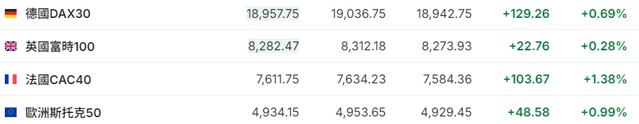 2. 截至发稿,德国DAX指数涨0.69%,英国富时100指数涨0.28%,法国CAC40指数涨1.38%,欧洲斯托克50指数涨0.99%。
