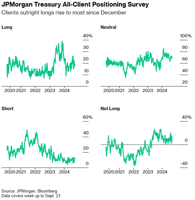 与此同时,在现货美债方面,上周美联储会议前的看涨势头依然保持不变,截至9月23日的一周,摩根大通的美债客户持有的净多头头寸保持稳定。在此期间,由于在美联储降息后债券市场的大幅曲线趋陡交易获得了动力,基准10年期美债收益率上升了约12个基点,至3.73%左右。