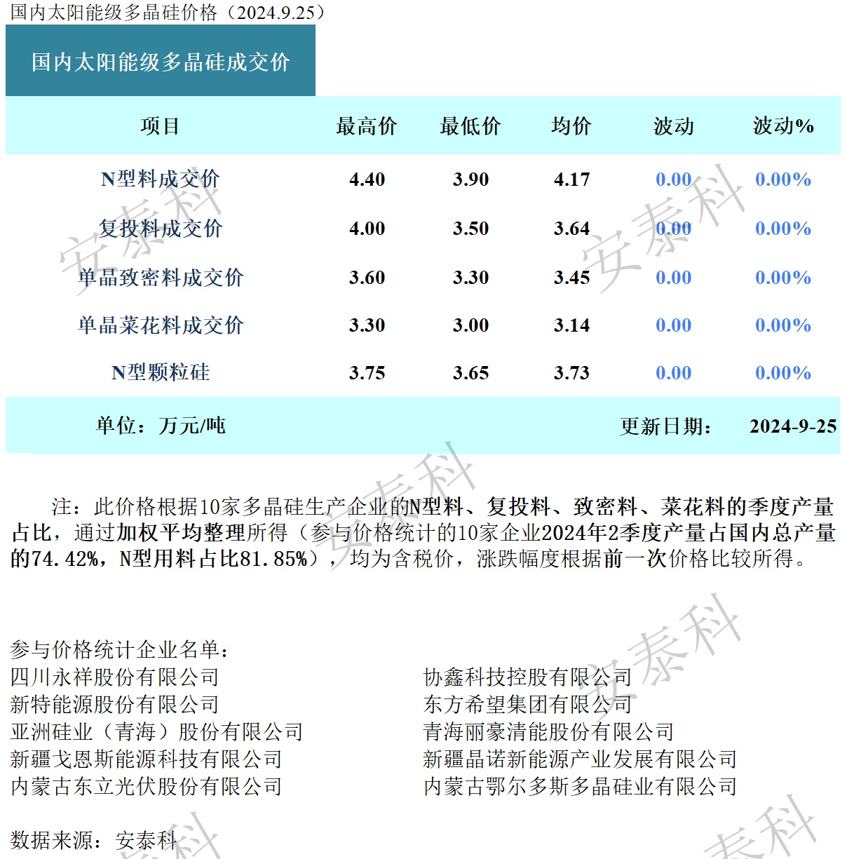 智通财经APP获悉,硅业分会发文称,本周多晶硅价格持平。其中n型棒状硅成交价格区间维持在3.90-4.40万元/吨,成交均价为4.17万元/吨;单晶致密料成交价格区间维持在3.30-3.60万元/吨,成交均价为3.45万元/吨;N型颗粒硅成交价格区间维持在3.65-3.75万元/吨,成交均价为3.73万元/吨。近期多晶硅价格持稳运行,预计未来价格的增长点在于枯水期产能替换幅度及多晶硅期货上市。