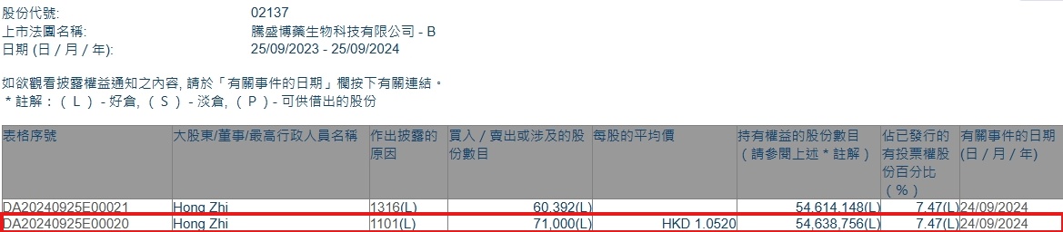 智通财经APP获悉,香港联交所最新资料显示,9月24日,董事会主席兼首席执行官Hong Zhi增持腾盛博药-B(02137)7.1万股,每股作价1.052港元,总金额约为7.47万港元。增持后最新持股数目约为5463.88万股,最新持股比例为7.47%。