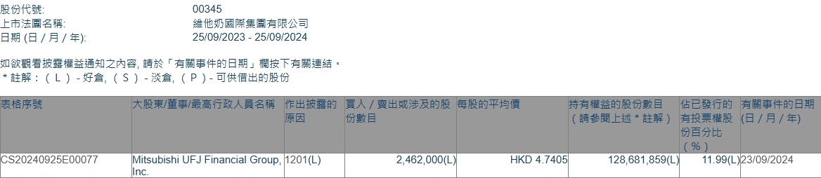 智通财经APP获悉,香港联交所最新资料显示,9月23日,三菱日联金融减持维他奶国际(00345)246.2万股,每股作价4.7405港元,总金额约为1167.11万港元。减持后最新持股数目约为1.29亿股,持股比例为11.99%。