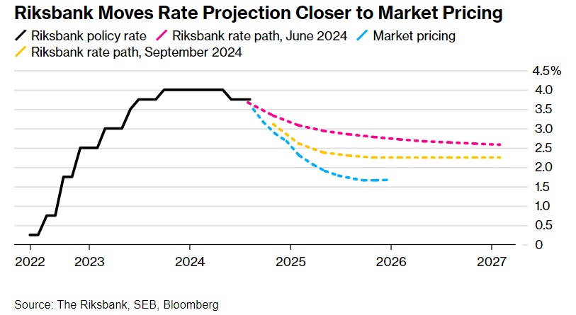 瑞典央行将基准利率降至3.25%,并概述了进一步的宽松政策,这可能会使基准利率在2024年底前显著降低。上周美联储意外降息50个基点后,全球央行的货币政策空间可谓全面扩大。