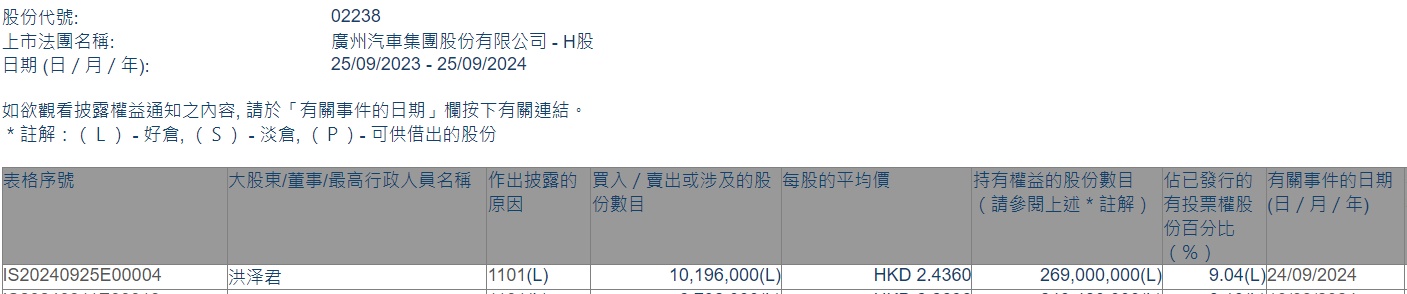 智通财经APP获悉,香港联交所最新资料显示,9月24日,股东洪泽君增持广汽集团(02238)1019.6万股,每股作价2.436港元,总金额约为2483.75万港元。增持后最新持股数目为2.69亿股,最新持股比例为9.04%。